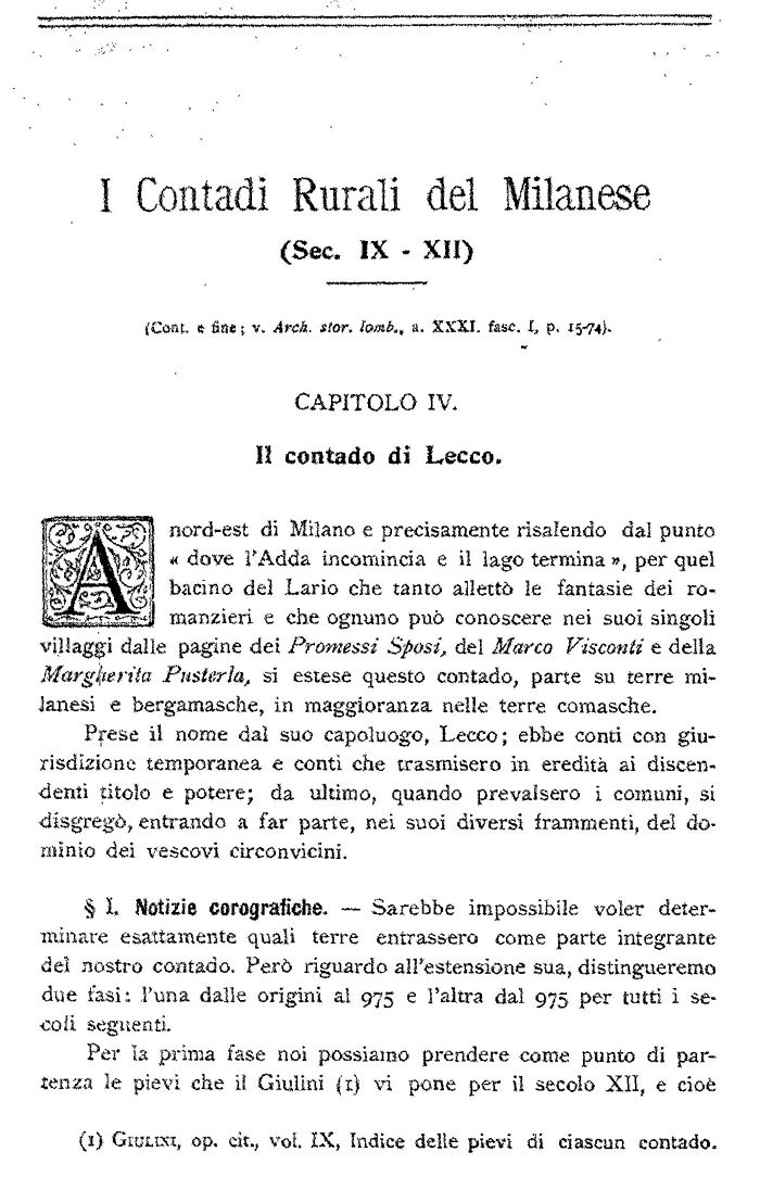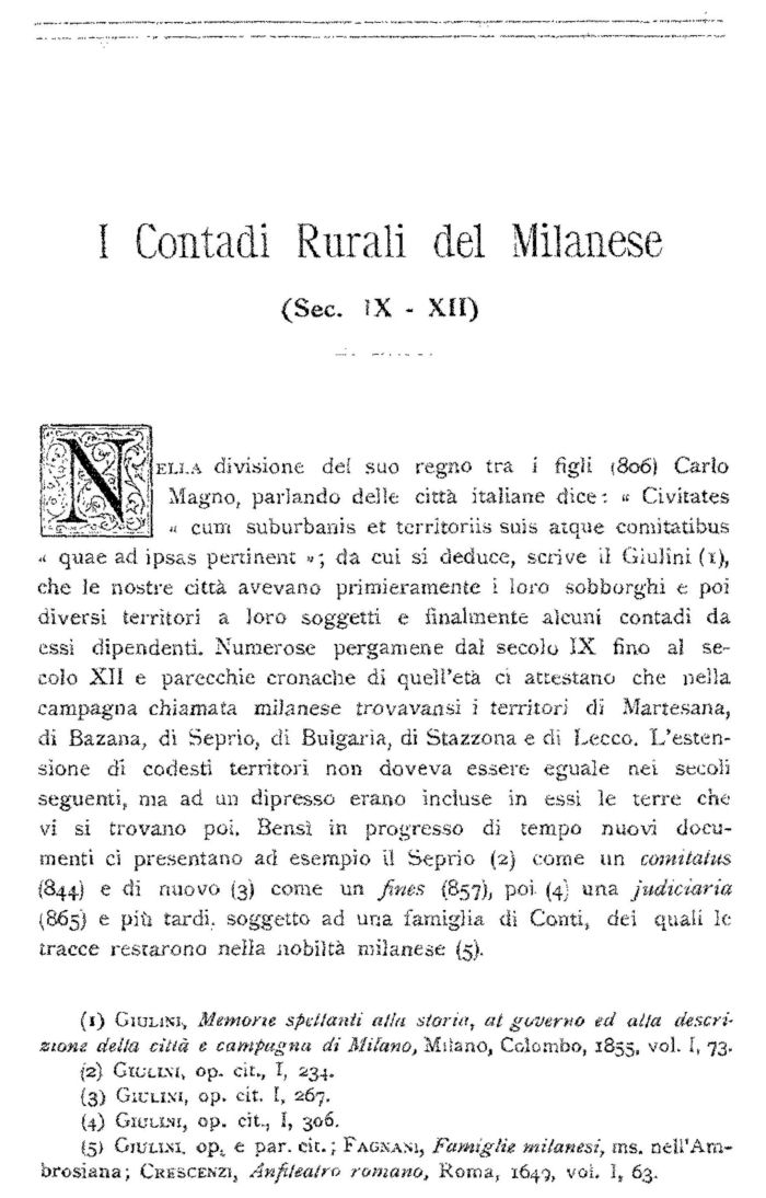 Come nascessero codesti contadi, in che cosa consistessero, se tutti fossero pari e quali rapporti - corressero tra essi e le città, furono domande cui diversamente risposero gli scrittori, talvolta contradicendosi. Gli è che nessuno, ch’io sappia, studiò di proposito l’organismo di essi. Se eccettuiamo il Muratori (2), il Leber (3), il nostro Giulini e qualche altro (4), non troviamo che il Dozio (5), il quale ci diede una monografia del Contado della Martesana frammentaria, incompleta, ricca di opinioni personali più che di deduzioni scientifiche (6); il Fè d’Ostiani che ci parlò dei conti rurali del Bresciano (7) e parecchi altri (8) i quali però volsero i loro studi ad età relativamente più recenti.