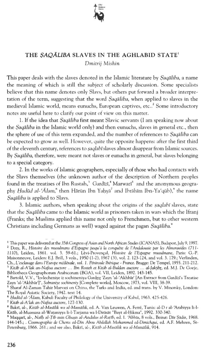These observations suggest that by Ṣaqāliba, Slavs and, in the context of this paper, Slavic slaves are usually meant. However, it is impossible to claim that the use of the word Ṣaqāliba was perfectly accurate in all cases. The possibility of error should be admitted. We abstain therefore from saying Slavic slaves, but use the term Ṣaqāliba slaves, recognising that most of the Ṣaqāliba whom we see in the Islamic sources were Slavs.