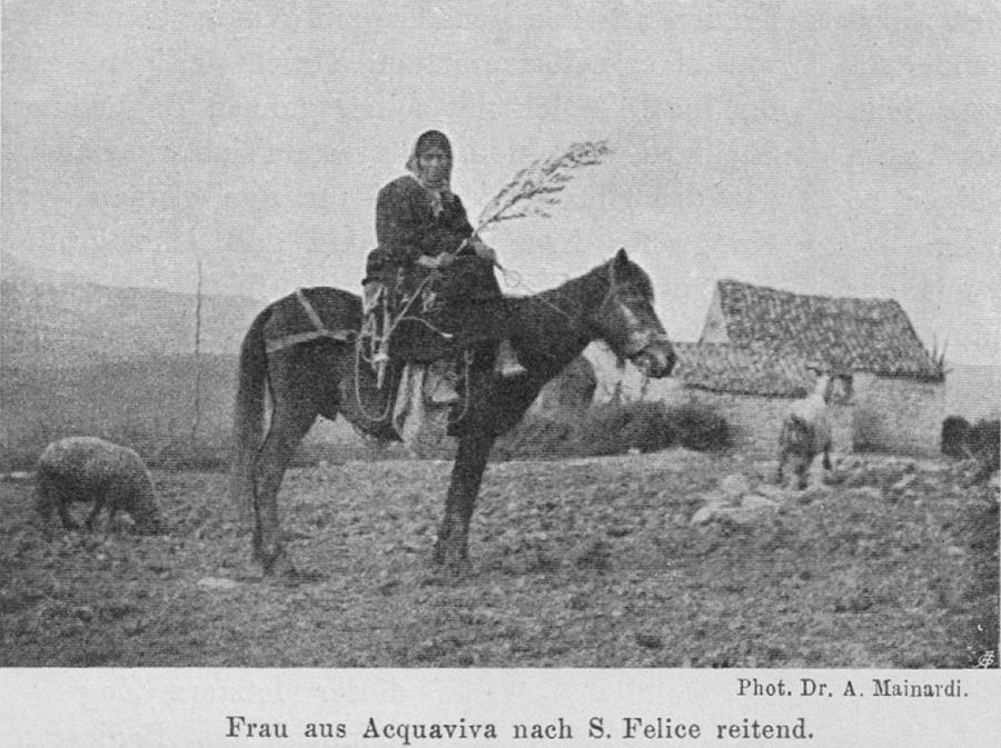 Frau aus Acquaviva nach S. Felice reitend. Phot. Dr. A. Mainanti.