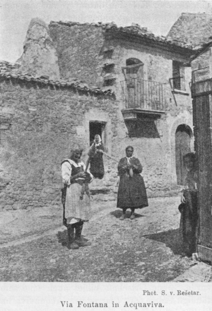 Die Lage Acquavivas ist, wie schon erwähnt, durch diejenige der Wasserquelle bedingt, auf welche die Ortsbevölkerung so stolz ist und um welche sie von allen benachbarten Ortschaften so sehr beneidet wird; somit liegt der Ort nicht auf einer Erhöhung, sondern auf einem Abhange, der in nordwestlicher Richtung sehr steil in das darunter liegende Tal abfällt. Mit seinen durchaus steinernen Häusern sowie den ziemlich engen und ziemlich primitiv gepflasterten Gassen, die hie und da auch von Häusern überwölbt sind, macht Acquaviva entschieden den Eindruck einer kleinen Stadt, obschon der Ort sonst keine städtischen Einrichtungen besitzt — keine Beleuchtung und keine Wasserleitung, keine Kanalisation und keine Straßenreinigung. Für die Beleuchtung sorgen die südliche Sonne und der helle Mond, bei mondlosen Nächten auch eine einzige Laterne, die am Hauptplatze angezündet wird; sonst muß man selbst eine Laterne in die Hand nehmen, wenn man gezwungen ist, spät abends in den Gassen herumzugehen. Das Wasser muß sich ein jeder von der Quelle selbst holen und ebenso muß er dafür sorgen, daß die Hausabfälle etc. aus den klosettlosen Wohnungen fortgeschafft werden. Die Straßenpolizei endlich wird vom Regen besorgt, der sich auf den durchwegs abschüssigen Gassen als öffentlicher Straßenkehrer sehr gut bewährt, wobei er auch von den zahlreichen Haustieren (Hühnern, Schweinen, Schafen usw.) unterstützt wird, die auf den Gassen frei herumlaufen und allerlei Abfälle, die von den Fenstern auf die Gasse geworfen werden, vertilgen.