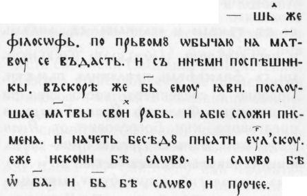 ловьць — рыбарь, кошьница— кошь, земьнъıи — земьскъ, господинъ — господь, искоушати— окоушати, законьникъ — законооучитель, распѧти — пропѧти, потопъ — вода, съвѣштати — съвѣтъ сътворити, оудавити сѧ — възвѣстити сѧ, възложити — положити, запечатьлѣти — знаменати, съдравъ — цѣлъ, послѣдовати — по немь ити, оглѧдѧти сѧ — озирати са, нѣмъ — гѫгънивъ, на землѧ — на соухо, прѣждр — древле, мимо ити — минѫти, корабь — ладьѣ.