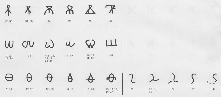 1) Хастата първоначално е била изграждана от три, по-късно от две отделни къси вертикални чертици; много рядко между тях може да се появи ъгъл, значително по-малък от 180° (срв. фигурата