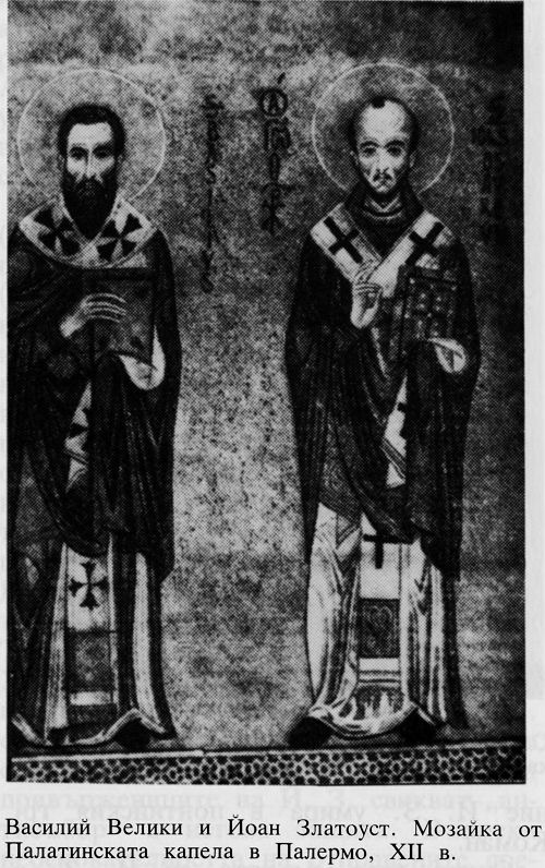 Василий Велики и Йоан Златоуст. Мозайка от Палатинската капела в Палермо, XII в.