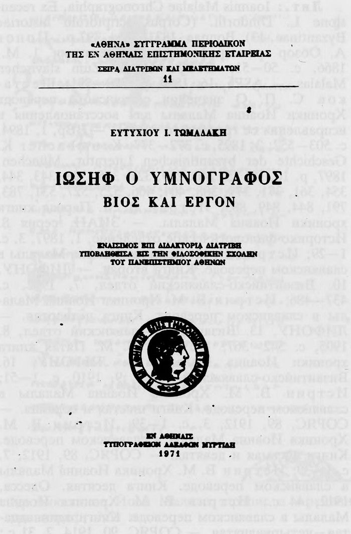 · Τομαδάκη Ευ. I. Ἰώσηφ ὁ ὑμνόγραφος. Βίος καὶ ἔργον. Αθῆναι, 1971, 306 p.