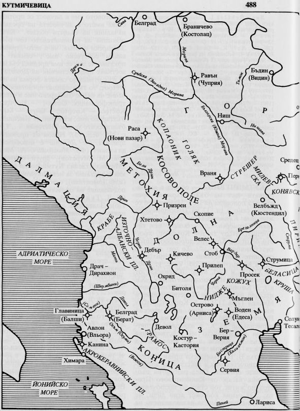 (82). КУТМИЧЕВИЦА — област в югозападната част на бълг. държава през втората половина на IX в. Названието се среща само в гл. 17 на Пространното житие на Климент Охридски от Теофилакт Охридски: