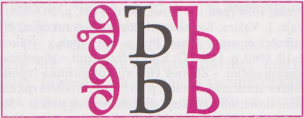 (3). Ъ, Ь. С еровете започва група от букви в старобълг. азбуки, които предават специфично слав. вокални фонеми (изключение прави само знакът ижица, поставян обикновено на последно място; изконността на графемата ижица в Константин-Кириловата азбучна система обаче е повече от съмнителна). По произход названието им е неясно — ѥръ и ѥрь (в Бандуричевия абецедар са дадени γεορ и γέρ, като γ = й, в Парижкия има само един ер — ъ, означен с peller, а името hier стои над буквата х, в Дивишевия също има само един, но ь, с название ger, като в случая g = й); то е запазено и до днес с уточненията „голям“ ер и „малък“ ер, респ. „твърд“ и „мек“. През старобълг. епоха еровете не са имали числена стойност; много по-късно, в хърватската глаголица, заместникът на двата ера — проста права чертица — е получил значение на 3000.