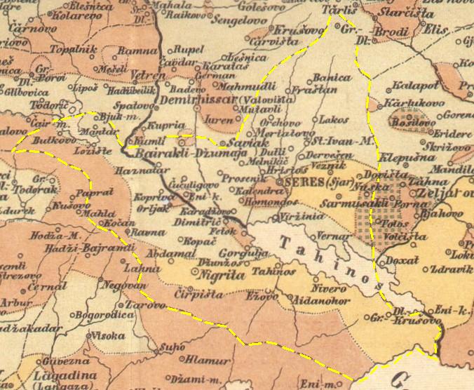 За Сѣрската Каза имаме двѣ турски изчисления на рѫцѣ. Едното е отъ салнамето за 1303 год., а другото отъ 1312. Обаче числата на първото сѫ земени отъ едно прѣсмѣтание направено още прѣзъ 1882 год., [1] когато е ставалъ прѣписъ на населението. Тѣ сѫ много стари, но сѫ по-прави, понеже тогава властитѣ не ги измѣнявали произволно. Споредъ това изчисление въ Сѣрската Каза има българи (булгаръ милетъ) 22 780, гръци (урумъ милетъ) 27 145, турци 30 940, евреи 1 007 и цигани 4 355. Въ числото на гръцитѣ като „урумъ милетъ” сѫ записани власитѣ отъ Джумая и доста българи отъ южнитѣ села и отъ Нигритската Околия,