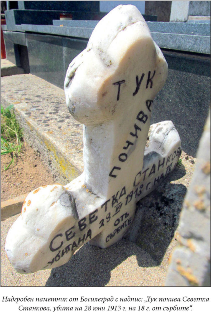 Надгробен паметник от Босилеград с надпис: „Тук почива Севетка Станкова, убита на 28 юни 1913 г. на 18 г. от сърбите“.