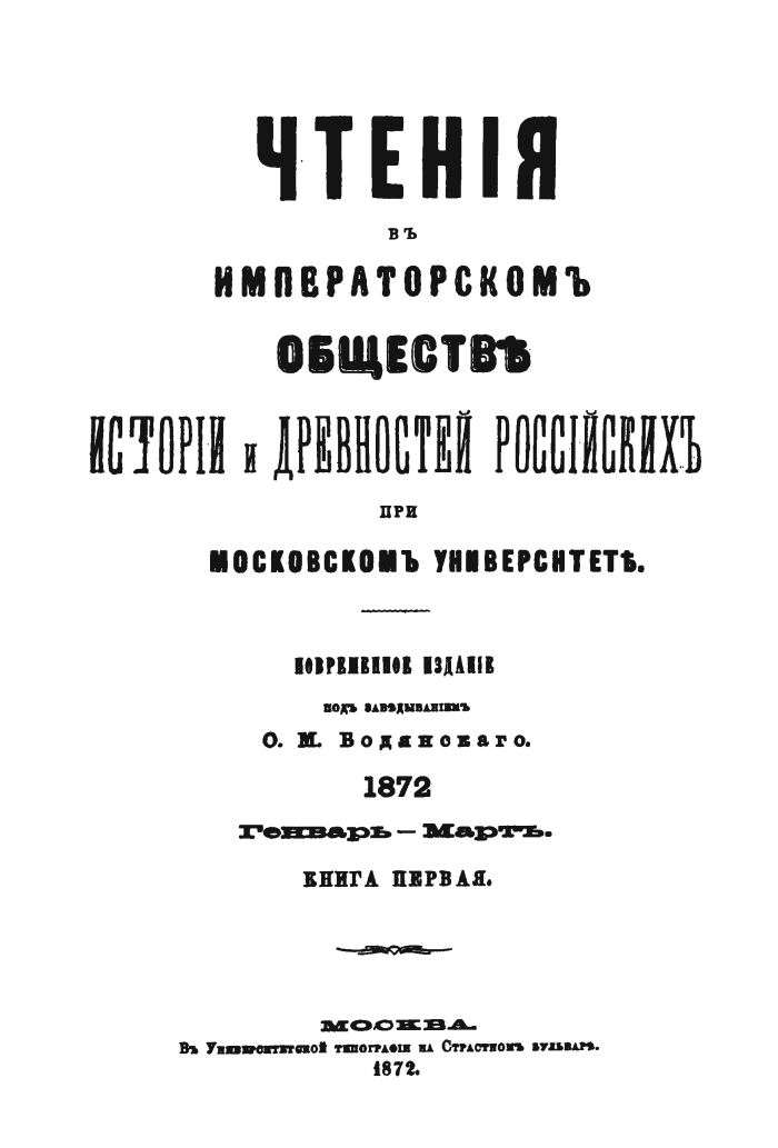 Повременное изданіе О. М. Бодянскаго. «Чтенiя въ Императорскомъ Обществѣ Исторiи и Древностей Россiйскихъ при Московскомъ Университетѣ», М., 1872 г., І кн., с. 25-32 Генварь-Мартъ. 1872