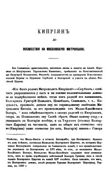 что одно изъ новѣйшихъ жизнеописаній сего Святителя начинается такъ: «Блаженный Кипріанъ, родомъ Сербъ изъ Тернова,» безъ всякихъ поясненій касательно такого сопоставленія? Не то же ли это, что сказать о комъ ни будь: «Сербъ изъ Петербурга, или Болгаринъ изъ Москвы, или Русскій изъ Бѣлграда,» безъ всякаго другаго поясненія? Полагаемъ, что послѣ свѣдѣтельства Григорія, какъ современника и родственника блаженнаго Кипріяна, вопросъ о Болгарскомъ происхожденій Святителя можетъ считаться рѣшеннымъ; ошибочное же названіе его у насъ Сербомъ, хотя и имѣло, какъ увидимъ ниже, свои причины, но все таки, какъ ошибочное, должно быть отвергнуто.