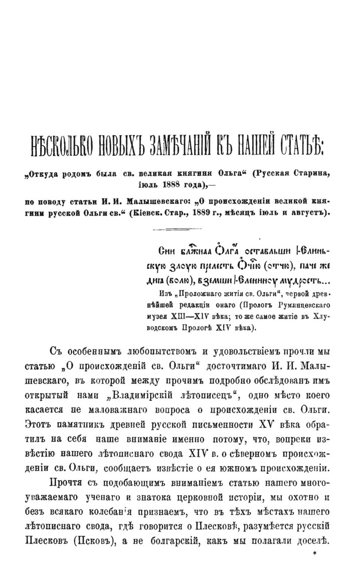 Это и приводить насъ къ заключенію, что извѣстіе о происхожденіи св. Ольги изъ Плескова (Пскова) не принадлежитъ первоначальной лѣтописи (нач. XII вѣка), а вставлено въ нее, какъ отголосокъ народныхъ сказаній новгородско-псковской области, возникшихъ подъ вліяніемъ мѣстнаго преданія о посѣщеніи великой княгиней Ольгою въ числѣ мѣстъ новгородской области русскаго Плескова (Пскова) въ 947 году. Но принадлежатъ ли это упоминаніе о Плесковѣ первоначальной лѣтописи нач. XII вѣка? Сомнительно! [1].