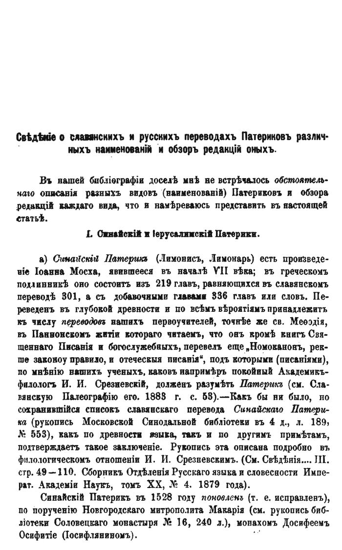 а) Синайскій Патерикъ (Лимонисъ, Лимонарь) есть произведеніе Іоанна Мосха, явившееся въ началѣ VII вѣка; въ греческомъ подлинникѣ оно состоитъ изъ 219 главъ, равняющихся въ славянскомъ переводѣ 301, а съ добавочными главами 336 главъ или словъ. Переведенъ въ глубокой древности и по всѣмъ вѣроятіямъ принадлежитъ къ числу переводовъ нашихъ первоучителей, точнѣе же св. Меѳодія, въ Паннонскомъ житіи котораго читаемъ, что онъ кромѣ книгъ Священнаго Писанія и богослужебныхъ, перевелъ еще „Номоканонъ, рекше заковоу правило, и отеческыя писанія", подъ которыми (писаніями), по мнѣнію вашихъ ученыхъ, каковъ напримѣръ покойный Академикъ-филологъ И. И. Срезневскій, долженъ разумѣть Патерикъ (см. Славянскую Палеографію его. 1883 г. с. 63).—Какъ бы ни было, но сохранившійся списокъ славянскаго перевода Синайскаго Патерика (рукопись Московской Синодальной библіотеки въ 4 д., л. 189, № 553), какъ по древности языка, такъ и по другимъ примѣтамъ, подтверждаетъ такое заключеніе. Рукопись эта описана подробно въ филологическомъ отношеніи И. И. Срезневскимъ. (См. Свѣдѣнія.... III. стр. 49—110. Сборникъ Отдѣленія Русскаго языка и словесности Императ. Академіи Наукъ, томъ XX, 4. 1879 года).