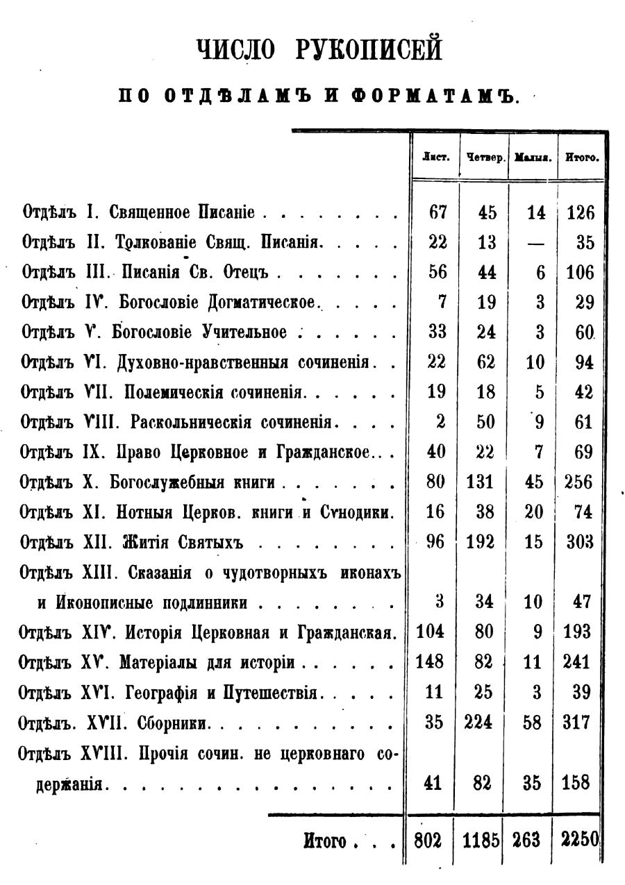 1) Общее число рукописей этого отдѣла, съ раздѣленіемъ по формату: листовыхъ, четвертныхъ и малаго формата (такъ онѣ раздѣляются въ каталогѣ гр. Уварова);