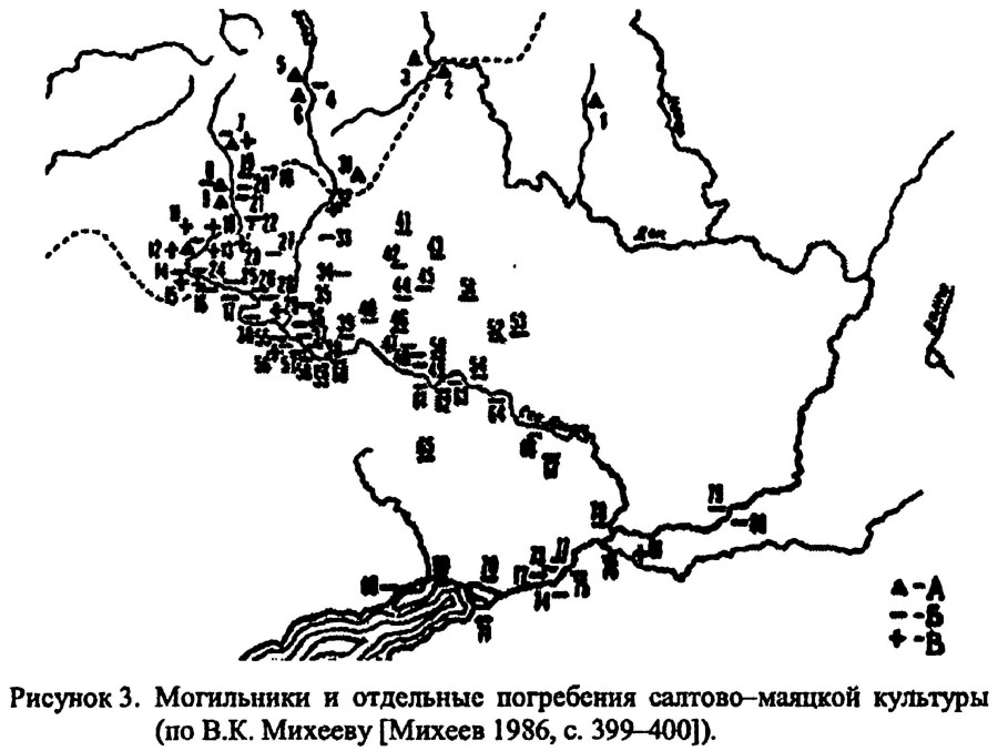 Рисунок 3. Могильники и отдельные погребения салтово-маяцкой культуры (по В.К. Михееву [Михеев 1986, с. 399-400])