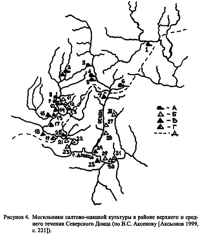 Условные обозначения: А - катакомбы; Б - ямные захоронения; В - трупосожжения; 1 - Воробьевка; 2 - Маяцкое; 3 - Урыв; 4 - Волоконовка; 5 - Ютановка; 6 - Нижняя Лубянка; 7 - Дмитриевское; 8 - Верхний Салтов; 9 - Старый Салтов; 10 - Кочеток; 11 - Новая Покровка; 12 - Мохнач I; 13 - Мохнач И; 14 - Готвальд (Камплицкий карьер); 15- Сухая Гомольша; 16- Красная горка; 17 - Залиман; 18 - Захаровка; 19Бочково; 20Нетайловка; 21 - Петровское; 22 Мартовая; 23 - Пятницкое; 24"База"; 25Балаклея; 26Кунье, 27 - Староверовка; 28 - Липчановка; 29 - Бондариха; 30 - Бугаевка; 31 - Подгоровка; 32 - Тополи; 33 - Покровский; 34 - Гончаровка; 35 - Лагерь; 36 - Шейковка; 37Лиманское озеро; 38Зливки; 39Кременная; 40Булгаковка; 41 - Николаевна; 42 - Белокуракино; 43 - Горшковка; 44 - Бутковка; 45 - Старобелъск; 46 - Айдар Николаевка; 47 - Безгино I; 48 - Безгино II; 49 - Вольный; 50 - Петровка; 51 - Новолимаревка III; 52 - Верх. Камьшная; 53 - Бараниковка; 54 - Гуркино; 55 - Сидорово; 56 - Маяки; 57 - Райгородок; 58 - Дроновка; 59 - Платоновка; 60- Кривая Лука; 61 - Родаково; 62 - Желтое; 63 - Ст. Луганская; 64 - Давыдово-Никольское; 65 - Торез (Шахта 19); 66 - Каменск-Шахтинский: 67 - Гуково; 68 - Беглица; 69 - Миусский залив; 70 - Недвиговский; 71 - Азов; 72 - Кривенский; 73 - Кирово; 74 - Артугановский; 75 - Багаевский; 76 - Семикаракоры; 77 - Станица Заплавская; 78 - Крымский; 79 - Правобережное Цимлянское; 80 - Саркел; 81 - Большая Орловка.