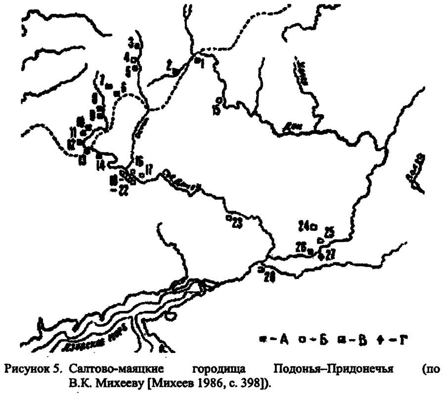 Рисунок 5. Салхово-маяцкие городища Подонья-Првдонечья (по В.К. Михееву [Михеев 1986, с. 398])