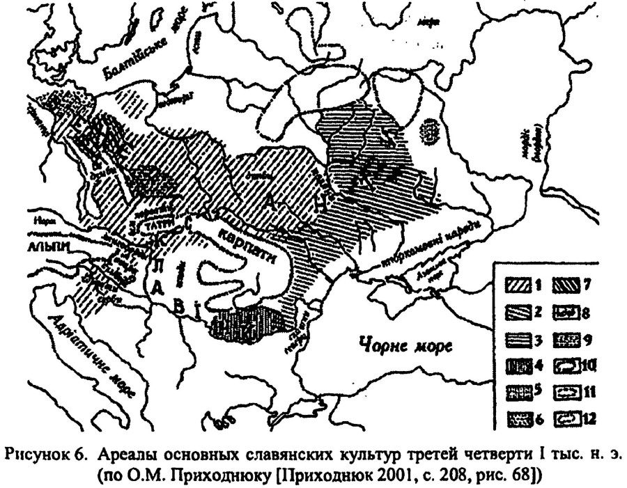 Рисунок 6. Ареалы основных славянских культур третей четверти I тыс. н. э. (по О.М. Приходнюку [Приходнюк 2001, с. 208, рис. 68])