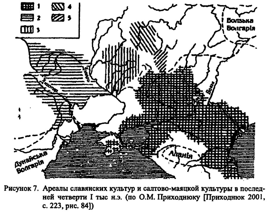 Рисунок 7. Ареалы славянских культур и салтово-маяцкой культуры в последней четверти I тыс н.э. (по О.М. Приходнюку [Приходнюк 2001, с. 223, рис. 84])