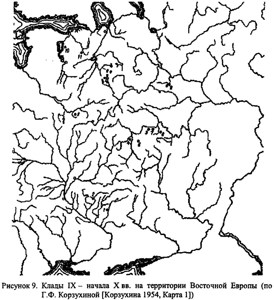 Рисунок 9. Клады IX - начала Х вв. на территории Восточной Европы (по Г.Ф. Корзухиной [Корзухина 1954, Карта 1])