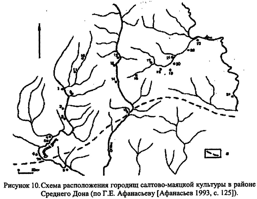 Рисунок 10. Схема расположения городищ салтово-маяцкой культуры в районе Среднего Дона (по Т.Е. Афанасьеву [Афанасьев 1993, с. 125])