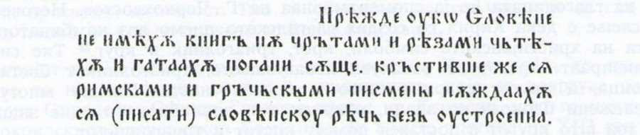 В. Штефаниќ во расправата на Храбар разликува три стадиума на развиток на словенската писменост: првиот стадиум на „чрти и рези" од времето пред покрстувањето; вториот со употреба на латинско и грчко писмо „без устроение" што започнало со покрстувањето; третиот стадиум на ново писмо со 38 знаци што ги измислил Константин Кирил. [37]