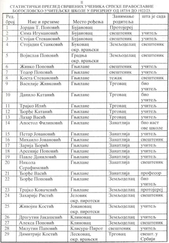 Систематизовани табеларни преглед ових питомаца Призренске Богословије давао је следеће податке [5]: