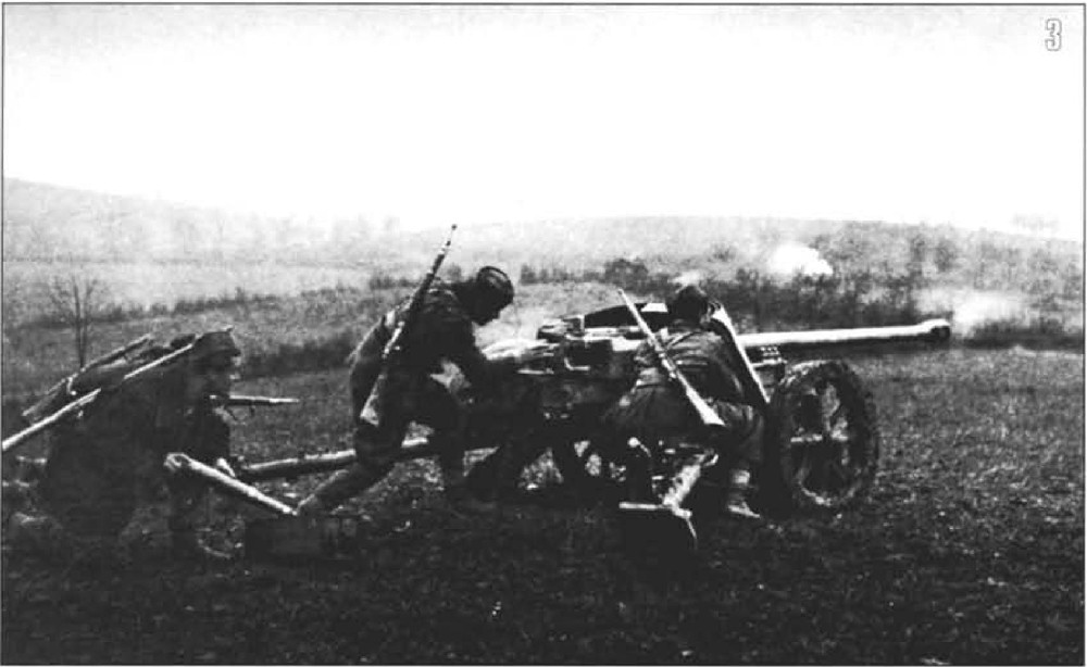 3. Yugoslavia's partisan army survived seven major Nazi offensives. The picture shows a PLA crew is firing a captured 50-mm Pak 38 gun on the German troops vie. the River Neretva. March 1943.