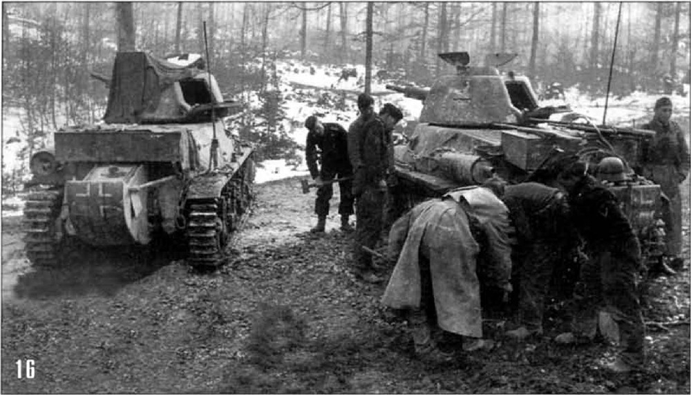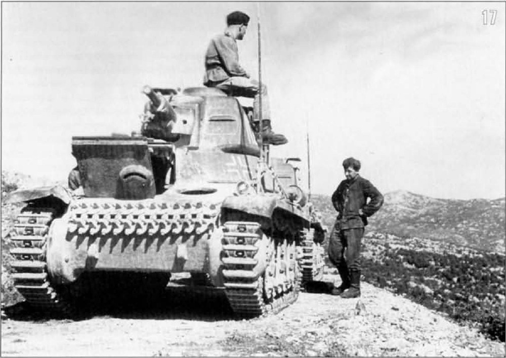 16, 17. Легкие танки Pz.Kpfw.38H(f) во время боевых действий на Балканах. От французских образцов они отличались наличием двустворчатых люков на крыше башни и дополнительными ящиками для инструментов и снаряжения. Танки принадлежат или 1-му батальону 202-го танкового полка вермахта, или бронероте 7-й горнострелковой дивизии СС. На фото 17 виден тактический номер танка — "112". Югославия, 1943 год (Bundesarchiv).