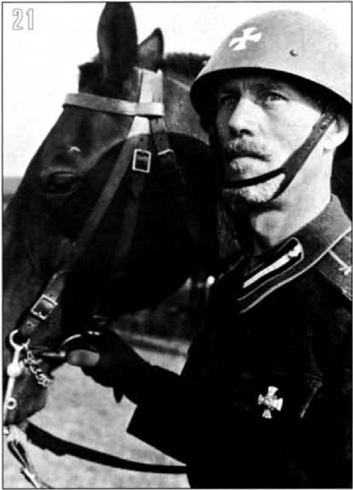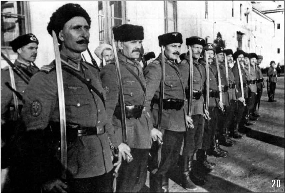 20, 21. То fight Communist partisans, Germans employed formations manned by the former Russian White Guard personnel. Picture 20 shows a Cossack guard outfit with the 15th Corps. Picture 21 shows an inspection parade of the Russian guard corps led by General Shteifon. Yugoslavia, 1943-1944.