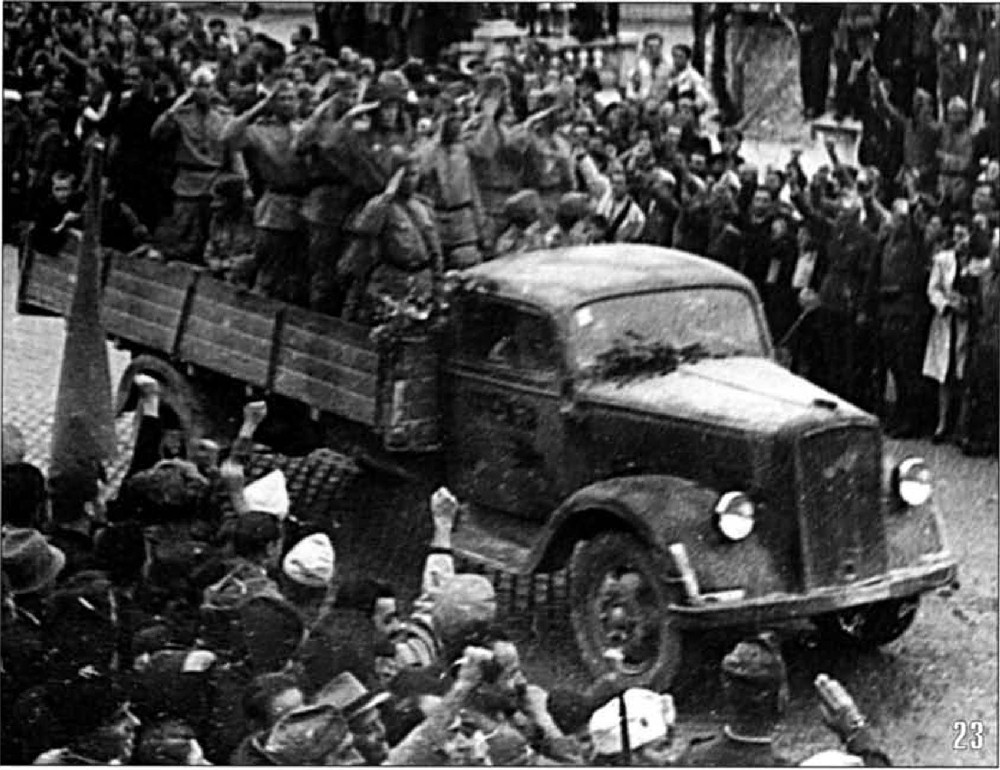 26-29. A Soviet motorized infantry convoy is rolling down Sofia's streets, with the locals welcoming it. The Soviet infantrymen are riding on US-made US-6 Studebaker lorries. 3rd Ukrainian Front, September 1944.