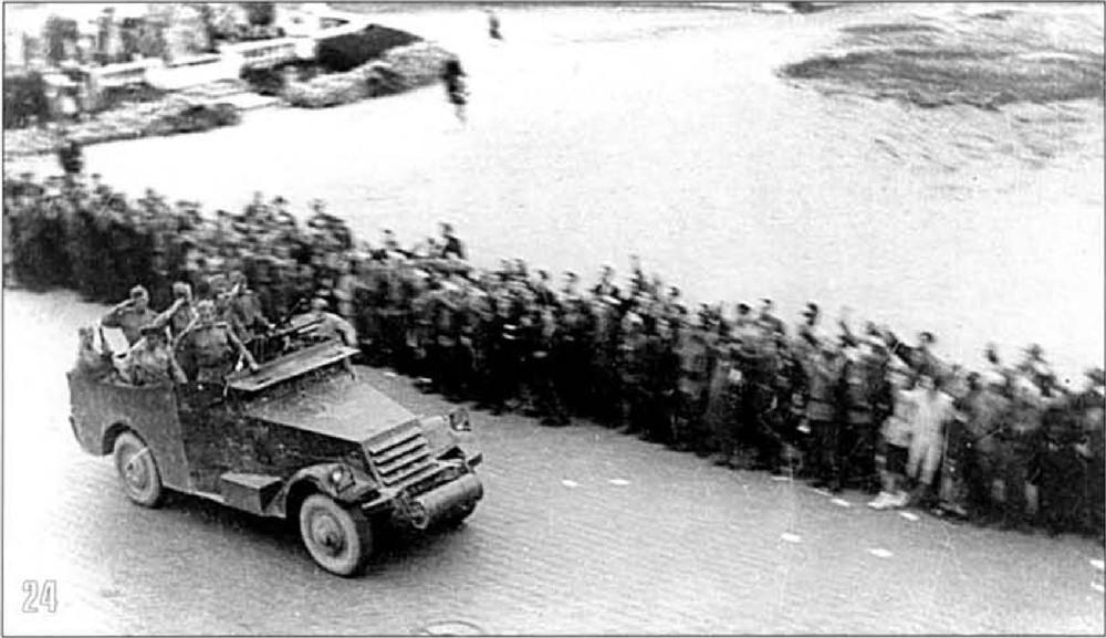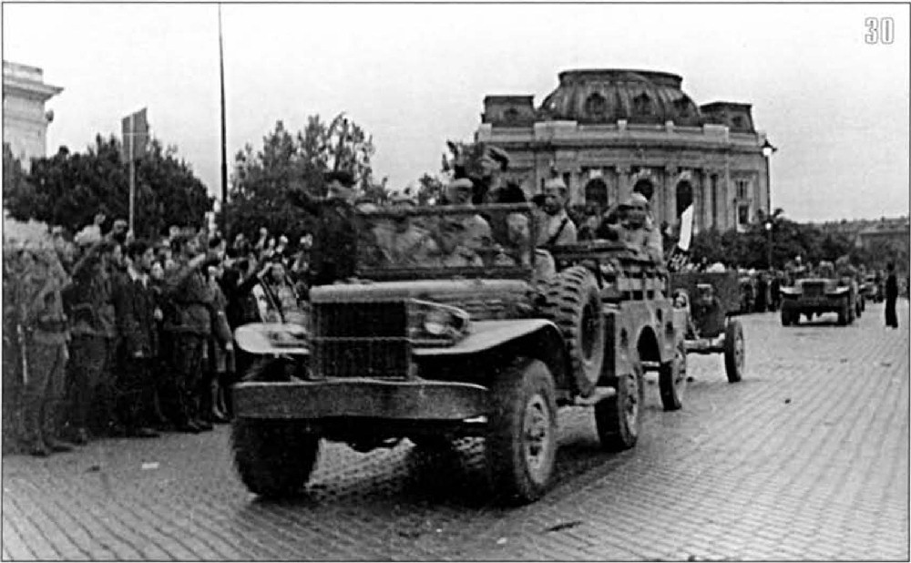 22-25. The 15th Guards Mechanised Brigade, 4th Guards Mechanised Corps on the streets of liberated Sofia. Picture 22 shows a Dodge WC, Picture 23 shows a captured Opel "Blitz" 3,6-36S, Picture 24 — a US- made M3A1 "Scout" armoured car, Picture 25 — a US-made M2 armoured personnel carrier (APC) is towing a 76,2-mm ZiS-3 gun. The 15th Guards Mech Bde's emblem was the swallow. 9 September 1944.