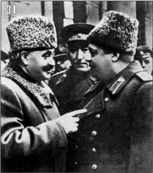 31. Marshal F.I. Tolbukhin, commander of the 3rd Ukrainian Front (right), and Col. Gen. S.S. Biryuzov are talking with the leader of the new Bulgaria government, Georgi Dimitrov. 1944.