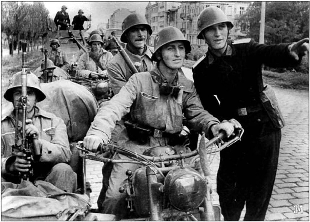 33-36. Вместе с советскими войсками участвовать в освобождении Сербии намеревалась и реорганизованная болгарская армия, которая была оснащена, в основном, немецким оружием. На снимках 33, 34 — моторизованная колонна болгарской армии. На переднем плане — мотоциклы BMW R-75, на заднем плане — бронеавтомобили Sd.Kfz.222 и грузовики "Рено" AHN. На фото 35, 36 — полугусеничный грузовик "Маультир" Sd.Kfz.3b с 50-мм противотанковым орудием Рак 38 на буксире проходит через триумфальную арку. Болгария, сентябрь 1944 года (АВЛ).
