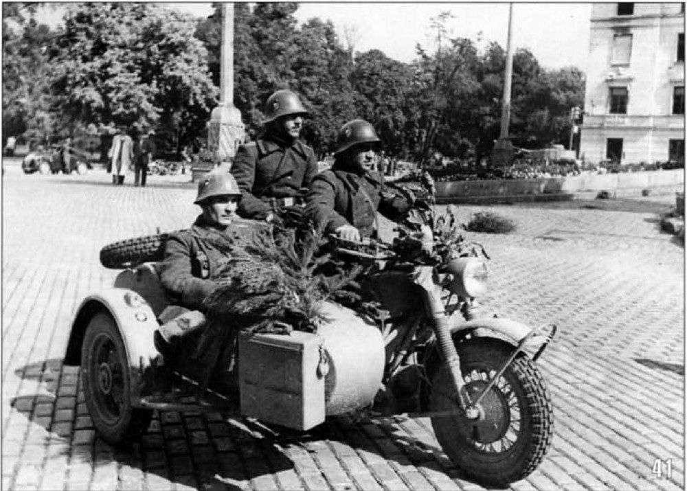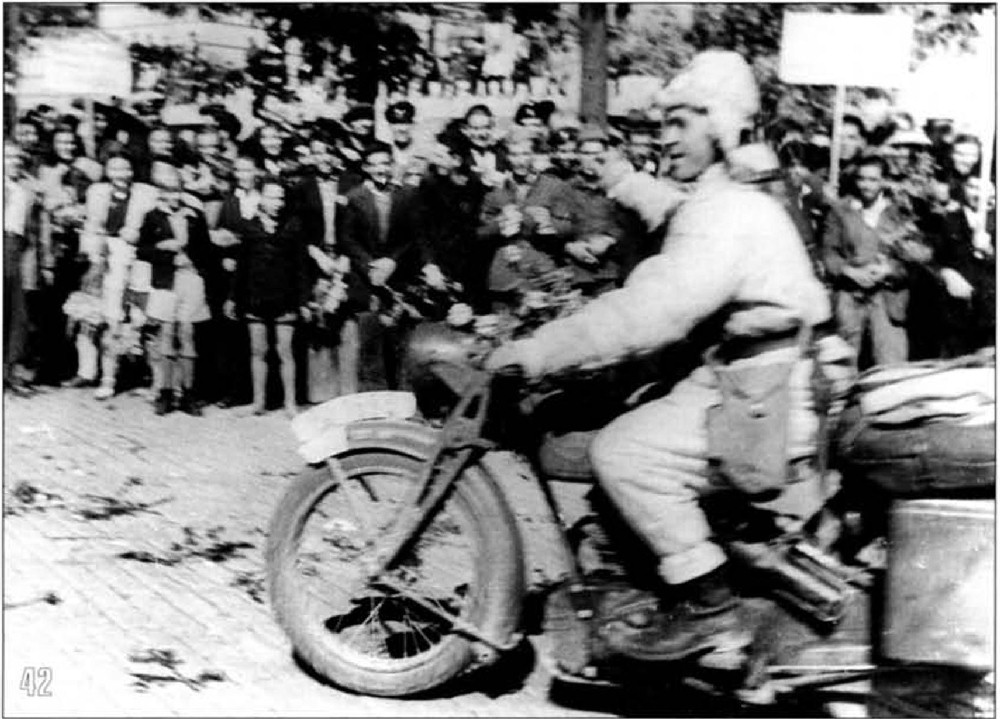 41, 42. Мотоциклисты болгарской армии отправляются воевать против своих недавних союзников. На снимке 41 — мотоцикл BMW R-75 немецкого производства. Октябрь 1944 года (РГАКФД).41, 42 Bulgarian Army motorcyclists are heading to fight their former allies. Picture 41 shows a German-made BMW R-75 motorcycle. October 1944.