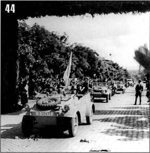 33-36. The reorganised Bulgarian Army, operating mostly German material, was going to take part in the liberation of Serbia together with the Soviet forces. Pictures 33 and 34 show a Bulgarian motorized infantry convoy, with a BMW-R-75 motorcycle in the foreground and Sd.Kfz.222 armoured cars and Renault AHN lorries in the background. Pictures 35 and 36 show a Sd.Kfz.3b "Maultir" halftrack with a 50-mm Pak 38 antitank gun passing via the Triumphal Arch. Bulgaria, September 1944.