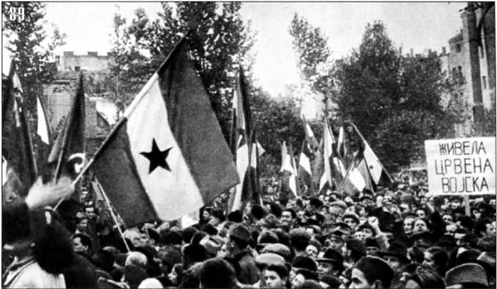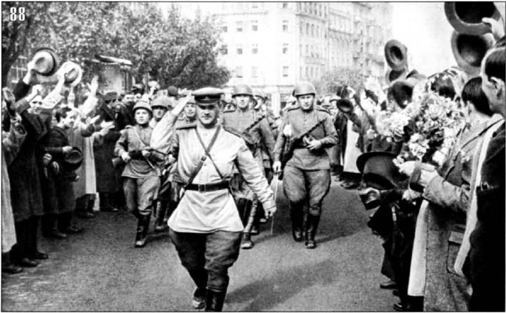 88-89. Soviet troops are marching into liberated Belgrade to a hearty welcome of the Belgraders. Serbia, October 1944.