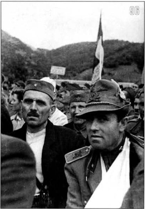 95, 96. Following the capitulation of Italy in 1943, the Italian Army virtually collapsed. Some personnel kept on serving Nazis, while the rest took the side of the Allies. Picture 95 shows Yugoslav partisans and Red Army soldiers escorting Italian POWs to the rear area. Picture 96 shows Yugoslav partisans and an Italian officer with the antifascist Garibaldi Division at a joint rally.
