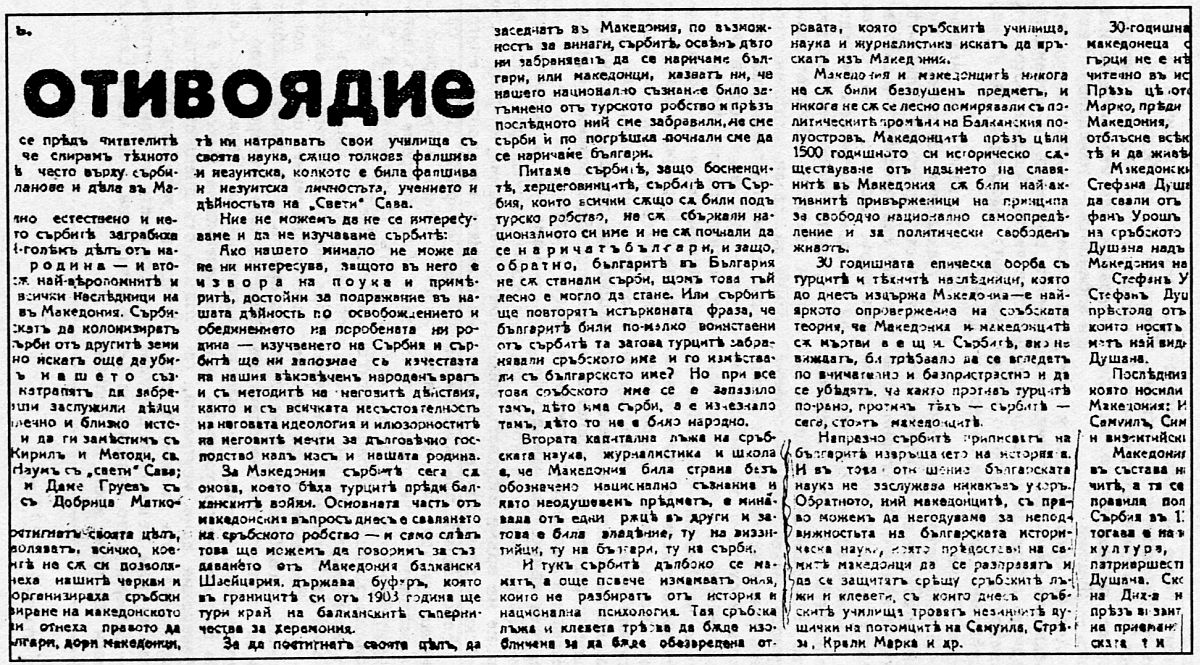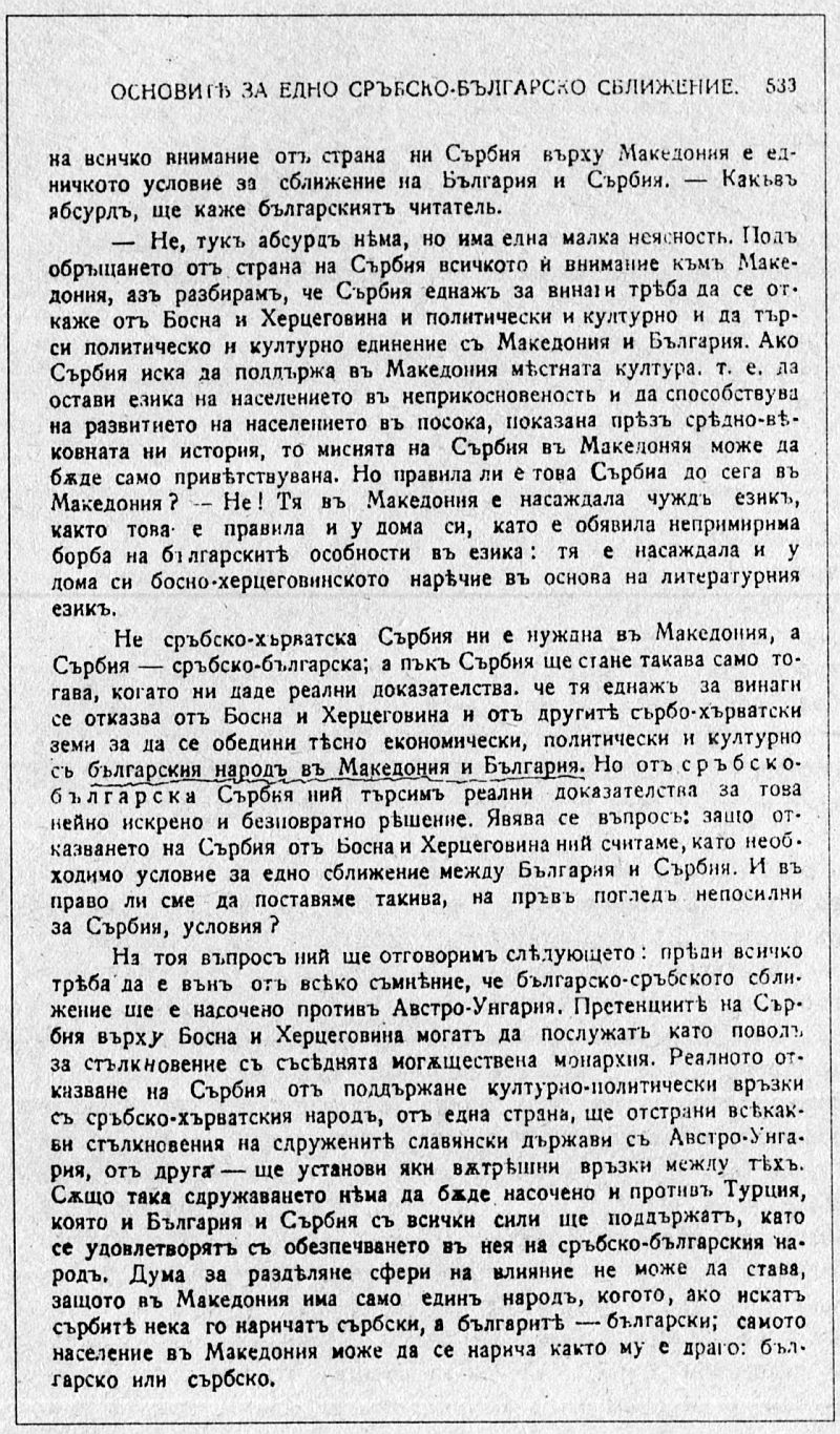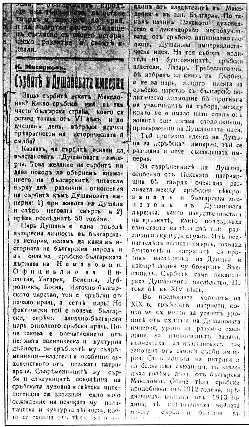 1 Като използува умело познанията си по миналото на сръбския народ, получени по време на следването си в Сърбия, Кръсте Мисирков подиграва различните измислици, които се съдържат в сръбската история и са насочени наи-вече срещу българите в Македония.