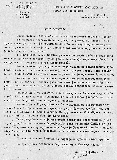 Писмо от 8.XII.1944 г. на ЦК на КПМ до ЦК на КПЮ, в което се съобщава за наличието на "елементи, които не са се сраснали с Ф. Югославия" по въпроса за азбуката и езика (факсимиле):