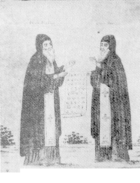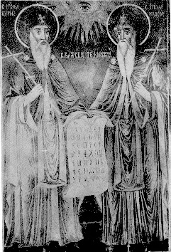 Графично изображение на Кирил и Методий в Български буквар, Москва, 1944 г. | Покръстването на българите