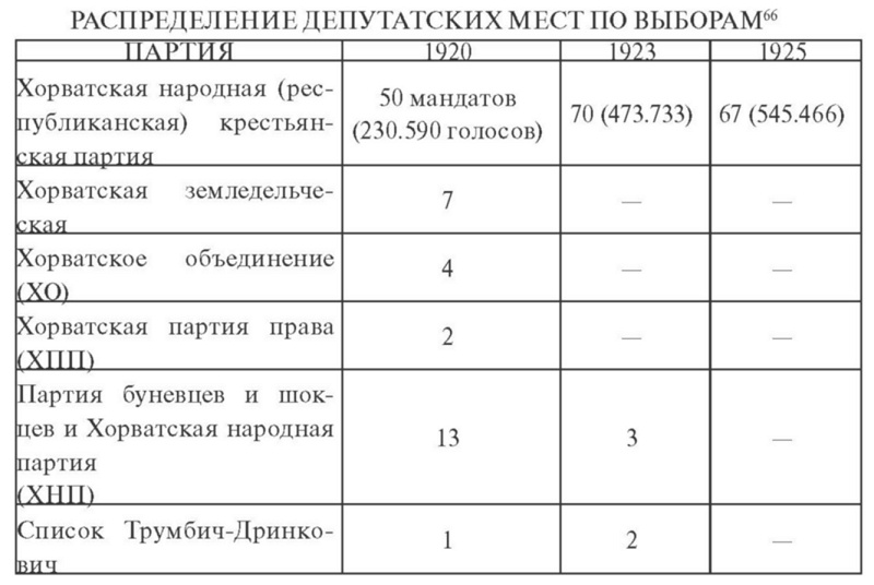 Этот впечатляющий политический успех был достигнут ХРКП уже на первых выборах в Конституционное собрание. Именно тогда хорватские избиратели отказали в поддержке политикам, принявшим участие в создании Королевства СХС с хорватской стороны [34]. В 1923 г. один из идеологов ХРКП Рудольф Херцег вспоминал: «Это были судьбоносные дни. Решался вопрос, хочет ли хорватский народ передать полномочия Радичу, или тем своим господам (курсив мой — А.С.), которые... решили вручить власть над Хорватией Белграду. Хорватский народ должен был высказаться или за свое самоопределение, или добровольно отдаться в рабство господам» [35].