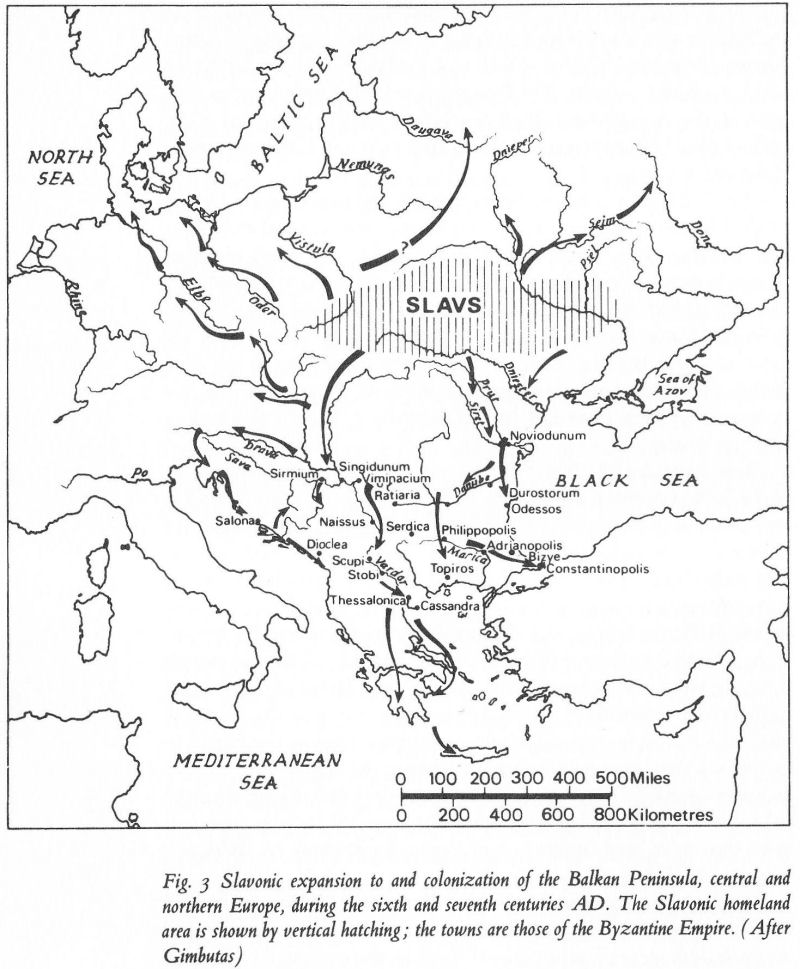 Fig. 3 Slavonic expansion to and colonization of the Balkan Peninsula, central and northern Europe, during the sixth and seventh centuries AD. The Slavonic homeland area is shown by vertical hatching; the towns are those of the Byzantine Empire. (After Gimbutas)