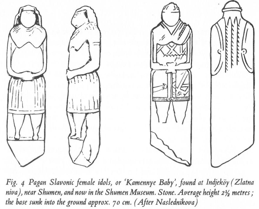 Fig. 4 Pagan Slavonic female idols, or ‘Kamennye Baby', found at Indjekdy (Zlatna niva), near Shumen, and now in the Shumen Museum. Stone. Average height 2 1/2 metres; the base sunk into the ground approx. 70 cm. (After Naslednikova)