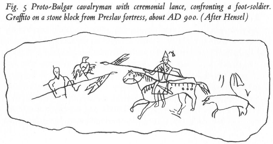 Fig. 5 Proto-Bulgar cavalryman with ceremonial lance, confronting a foot-soldier. Graffito on a stone block from Preslav fortress, about AD 900. (After Hensel)