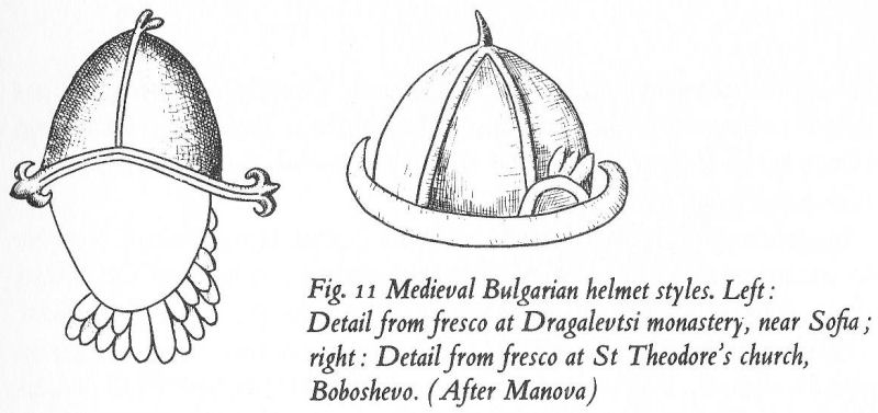 Fig. 14 A Bulgarian tsar (Ivan Assen II ?) and his warriors. Scene commemorating the Battle of Klokotnitsa, from a fourteenth-century fresco painting in the church of Saints Peter and Paul, Great Tărnovo. (After Naslednikova)