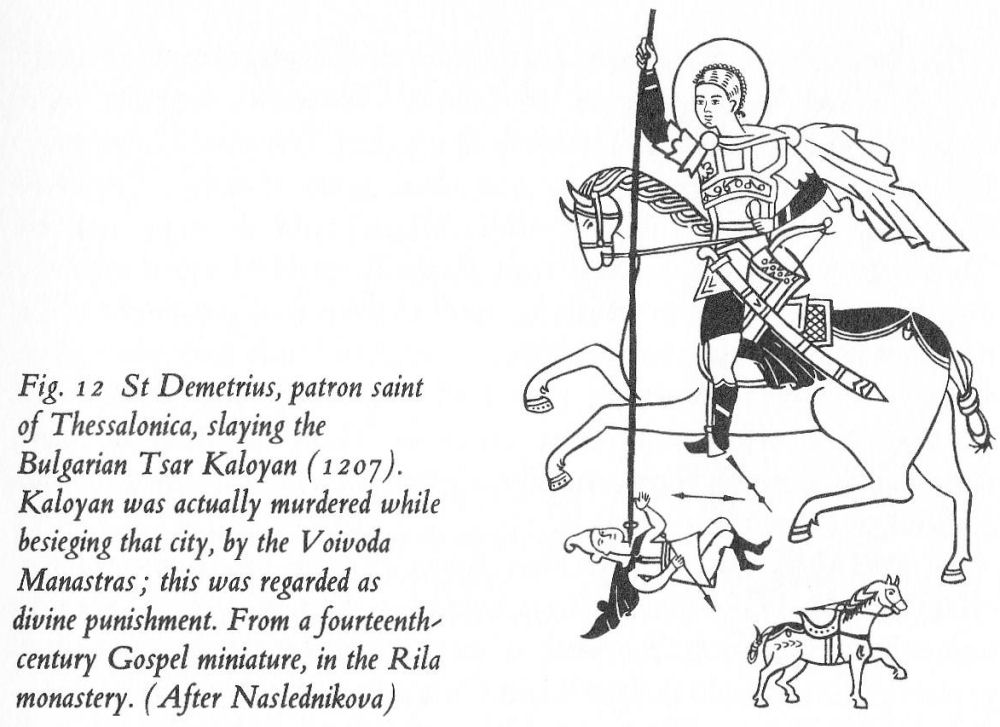 Fig. 12. St Demetrius, patron saint of Thessalonica, slaying the Bulgarian Tsar Kaloyan (1207). Kaloyan was actually murdered while besieging that city, by the Voivoda Manastras; this was regarded as divine punishment. From a fourteenth-century Gospel miniature, in the Rila monastery. (After Naslednikova)
