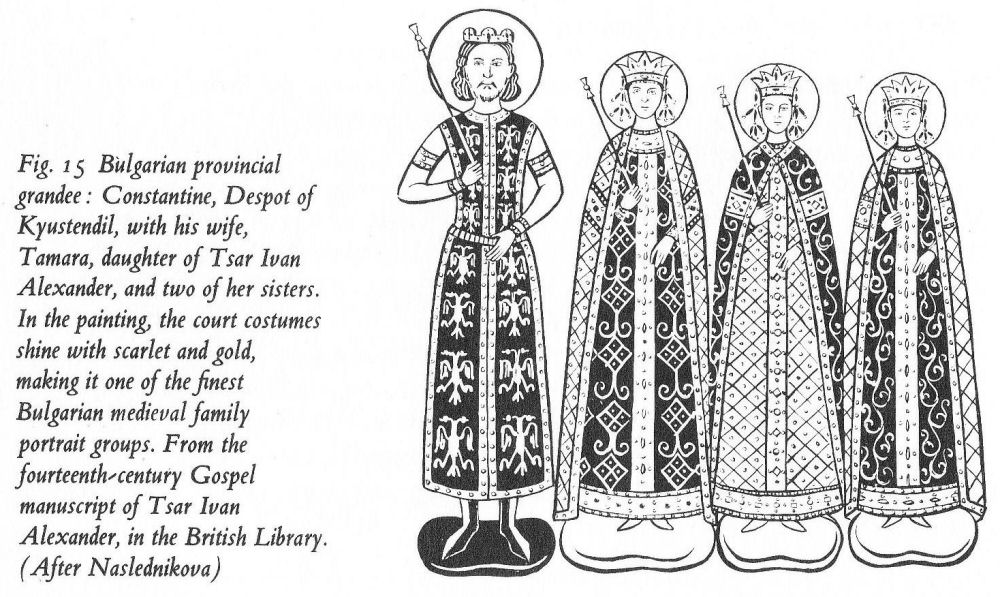 Fig. 15 Bulgarian provincial grandee: Constantine, Despot of Kyustendil, with his wife, Tamara, daughter of Tsar Ivan Alexander, and two of her sisters. In the painting, the court costumes shine with scarlet and gold, making it one of the finest Bulgarian medieval family portrait groups. From the fourteenth-century Gospel manuscript of Tsar Ivan Alexander, in the British Library. (After Naslednikova)