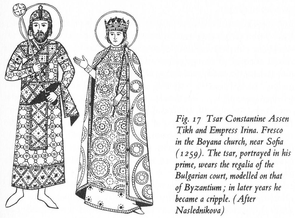 Fig. 17 Tsar Constantine Assen Tikh and Empress Irina. Fresco in the Boyana church, near Sofa (1259). The tsar, portrayed in his prime, wears the regalia of the Bulgarian court, modelled on that of Byzantium; in later years he became a cripple. (After Naslednikova)