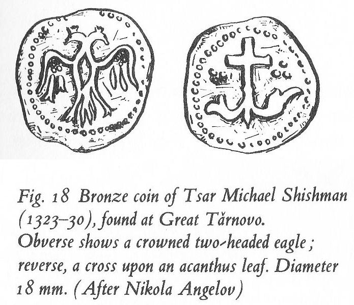 Fig. 18 Bronze coin of Tsar Michael Shishman (1323-30), found at Great Tărnovo. Obverse shows a crowned two'headed eagle; reverse, a cross upon an acanthus leaf. Diameter 18 mm. (After Nikola Angelov)