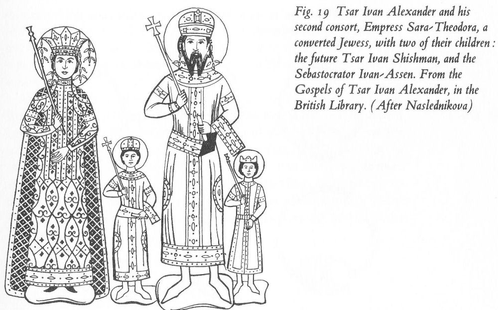 Fig. 19 Tsar Ivan Alexander and his second consort, Empress Sara- heodora, a converted Jewess, with two of their children: the future Tsar Ivan Shishman, and the Sebastocrator Ivan Assen. From the Gospels of Tsar Ivan Alexander, in the British Library. (After Naslednikova)
